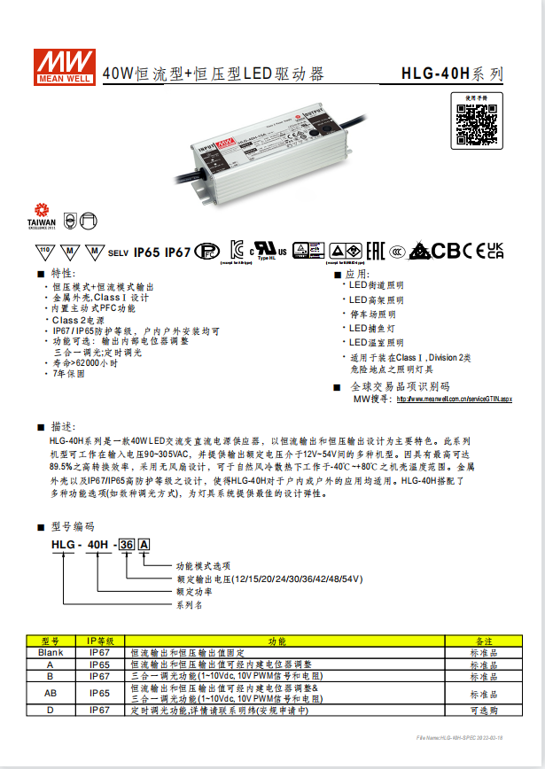 瓦數(shù): 40W~600W 功能特性 90~305VAC交流輸入,內(nèi)建主動(dòng)式功率因子矯正功能(active PFC) 96%超高效率(HLG-600H) 金