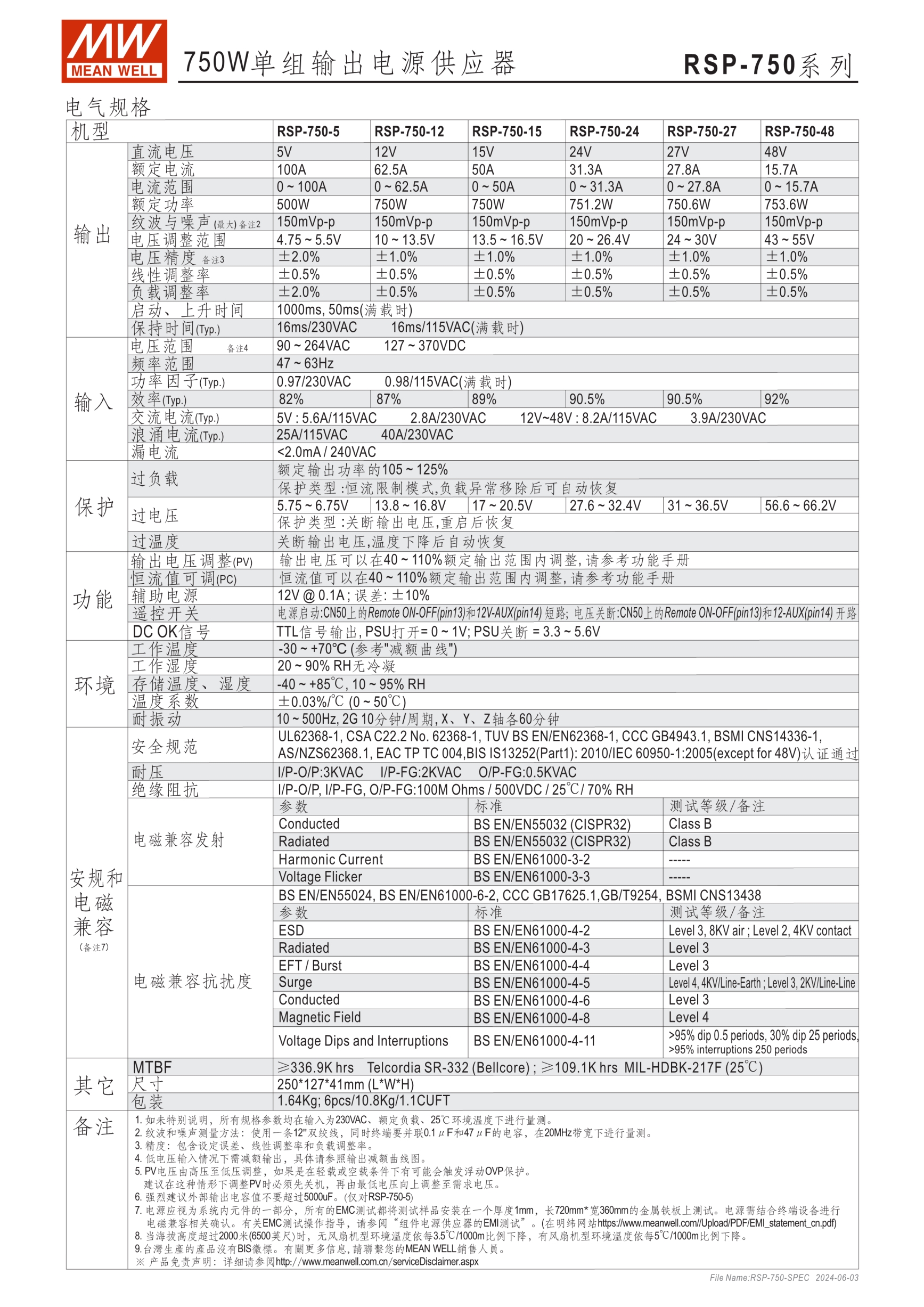 內(nèi)建主動式功率因子矯正功能(active PFC) 輸出電壓可程序 輸出電流(Icc)可程序 (RSP-750/1600 only) RSP-750/1000/1600/2000為1U(41mm)低高度設(shè)計,(RSP-1500/2400/3000為2U) 內(nèi)建主動式并聯(lián)功能(除RSP-750) 5年保固期