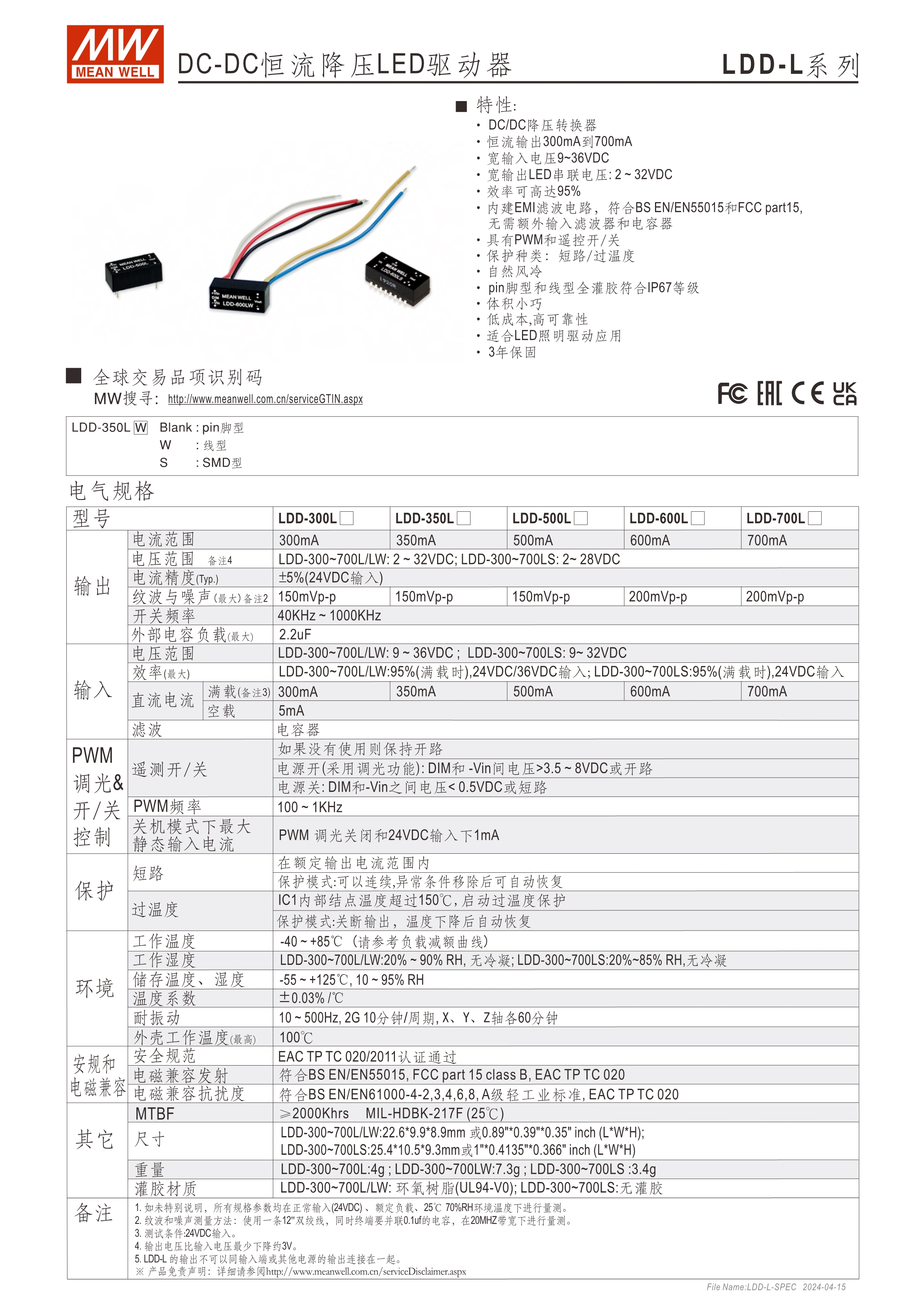 DC/DC降壓式恒流輸出LED驅動器 最高達97%超高效率 內建PWM+模擬調光功能及開/關遙控功能 IP67防護等級 3年保固 具備插pin及出線兩種型式