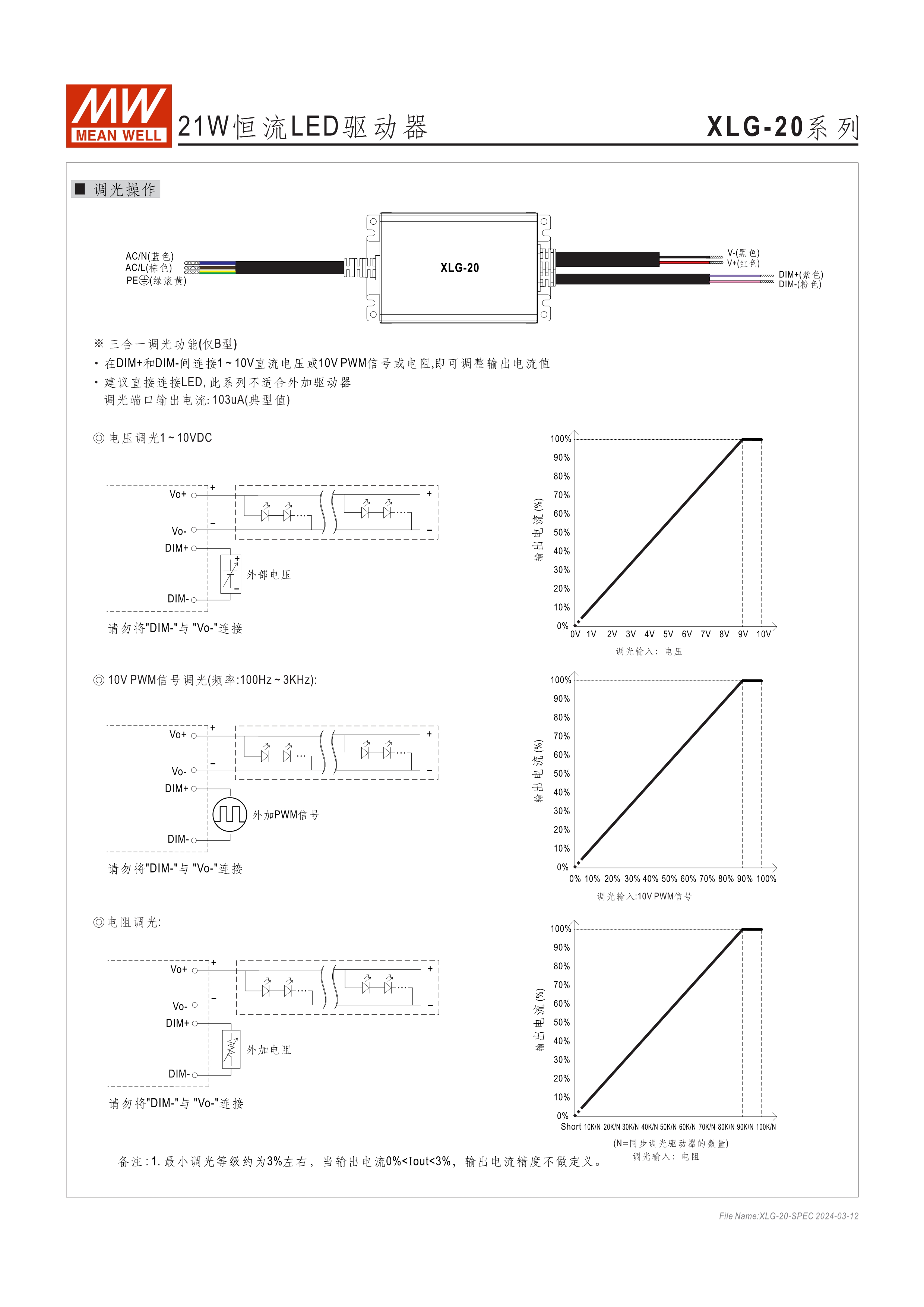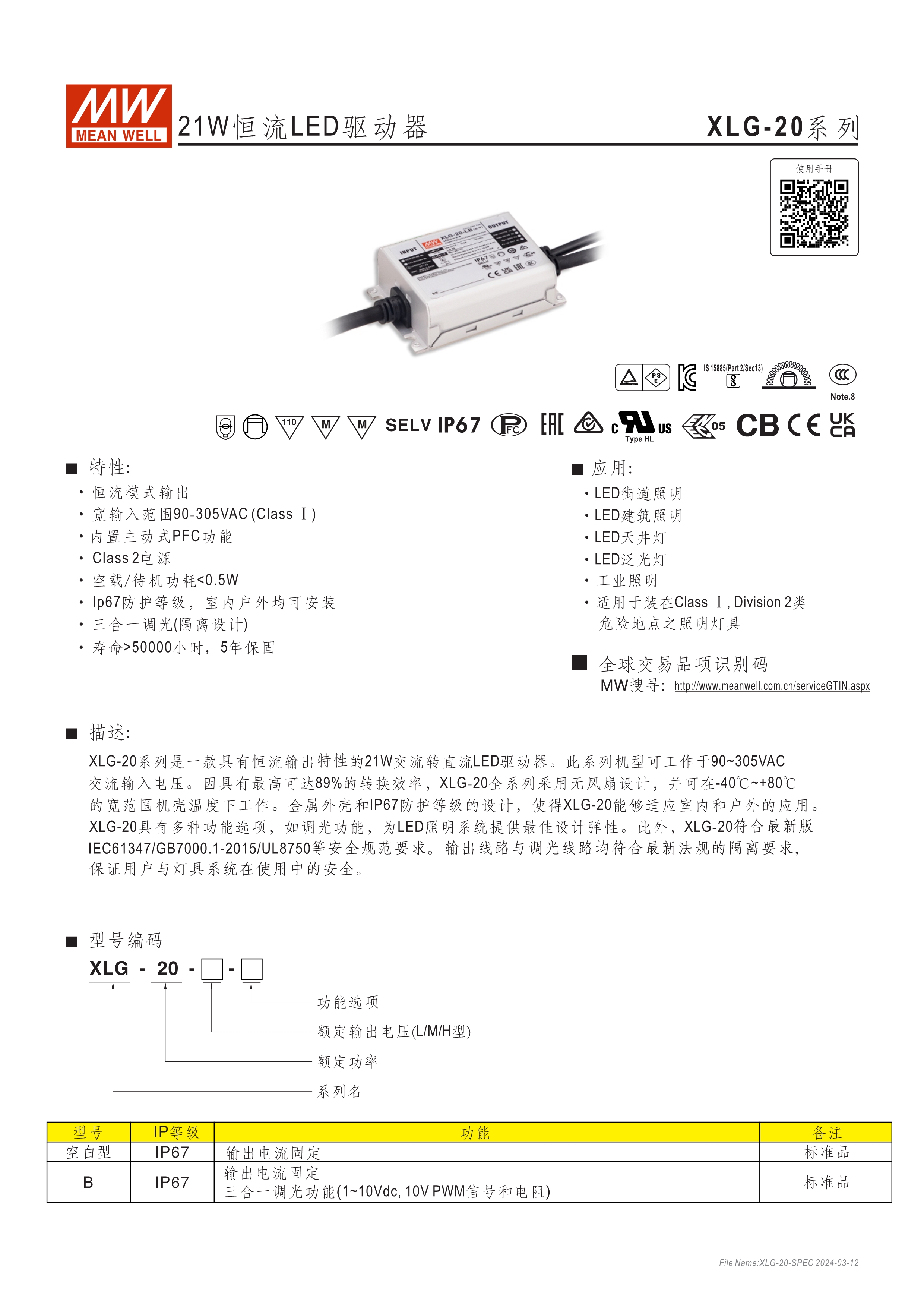寬電壓輸入范圍100~305VAC (XLG-20為90~305VAC) 寬電流輸出可調整恒功率設計 (XLG-20為恒流模式) 主動式PFC設計及輸出效率可達90% 調光功能: 三合一 / DALI 保護功能:短路、過電壓、過溫度 雷擊保護耐壓設計6KV(L/N-FG)/4KV(L-N); XLG-20為4KV(L/N-FG)/2KV(L-N) 5年保固
