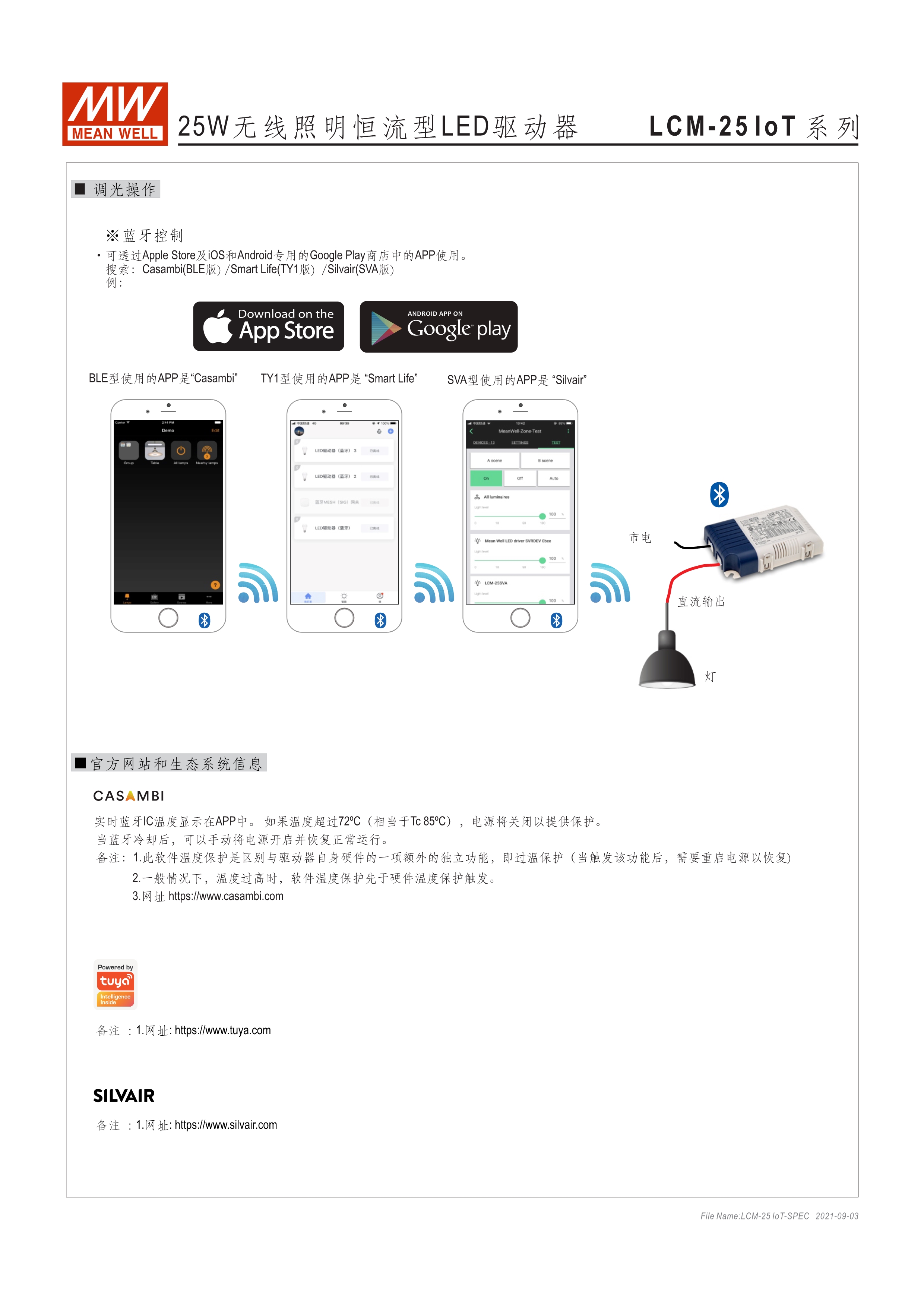 恒流輸出模式多段可選 無頻閃設(shè)計(jì) 塑料外殼及符合Class II無地線設(shè)計(jì) 主動(dòng)式PFC設(shè)計(jì) 調(diào)光功能:全系列藍(lán)芽智能控制及Push Dim(僅LCM系列) 雷擊保護(hù)耐壓設(shè)計(jì)2KV(L-N) 保護(hù)功能:短路、過電壓、過溫度