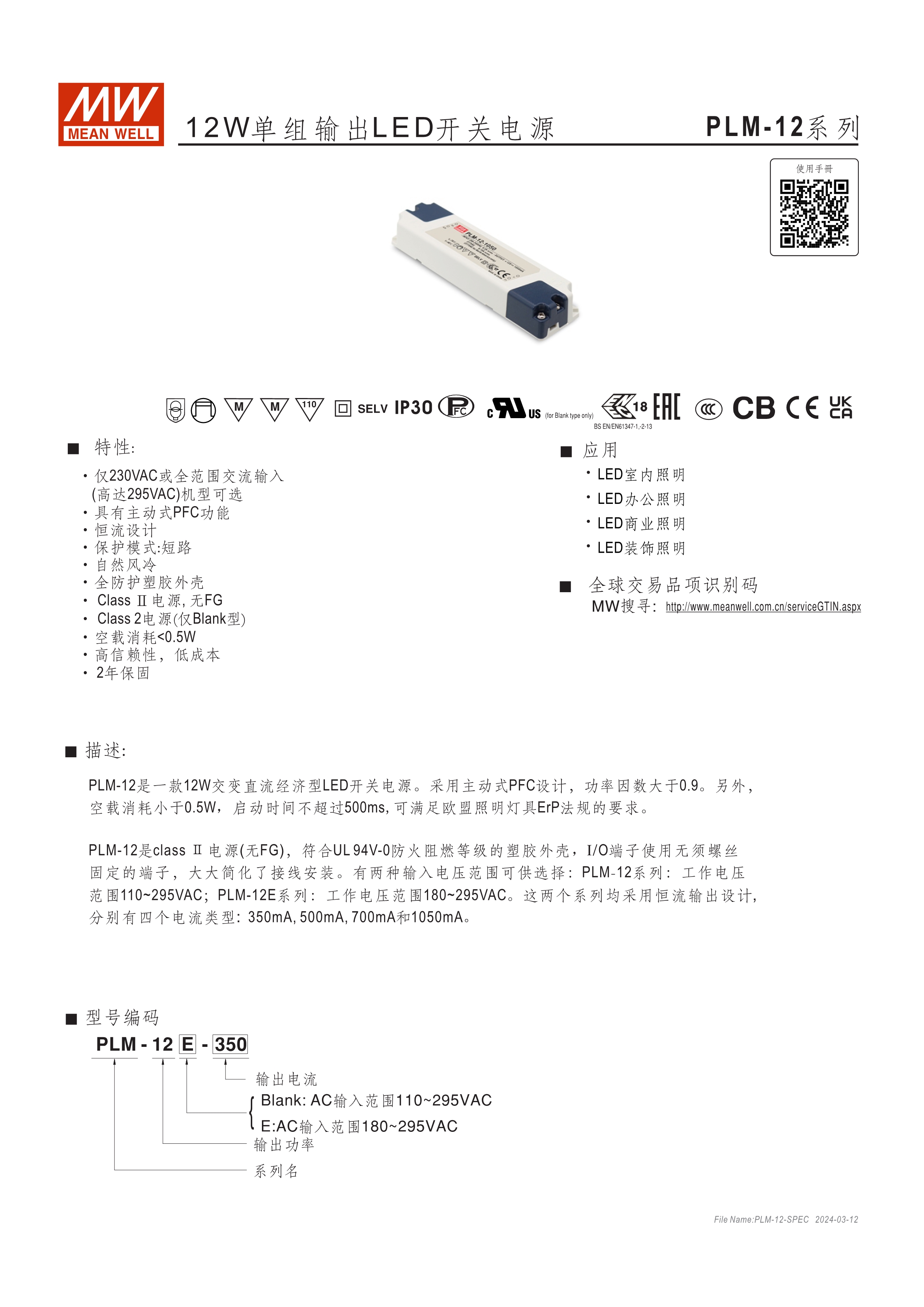 110~295VAC交流輸入 (E型:180~295VAC交流輸入) 內建主動式功率因子矯正功能 (active PFC) 塑料外殼,IP30防護等級 Class II設計,無FG 壓線式輸出/輸入端子臺 恒流設計 空載待機消耗瓦數<0.5W 適合于LED室內照明相關應用