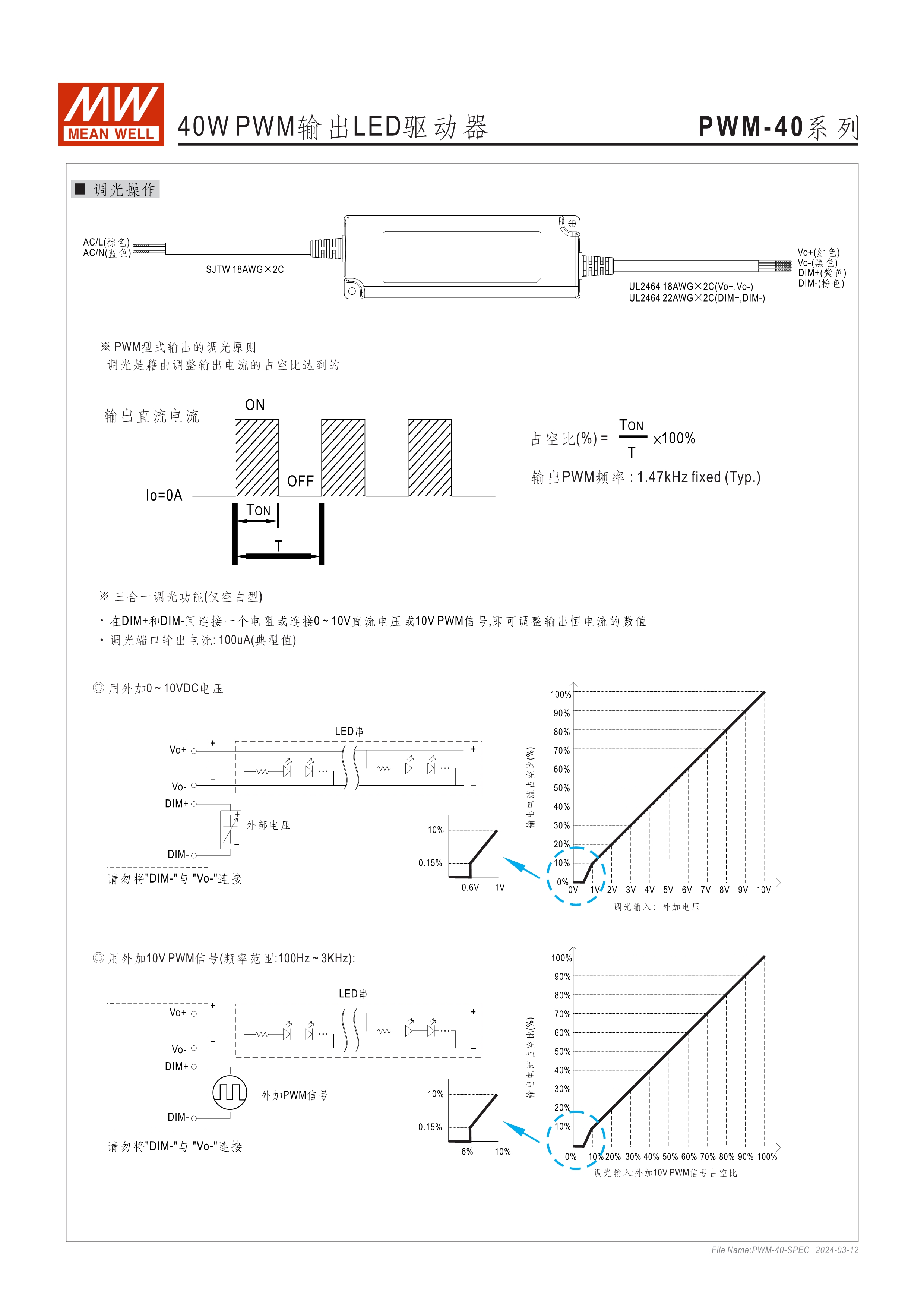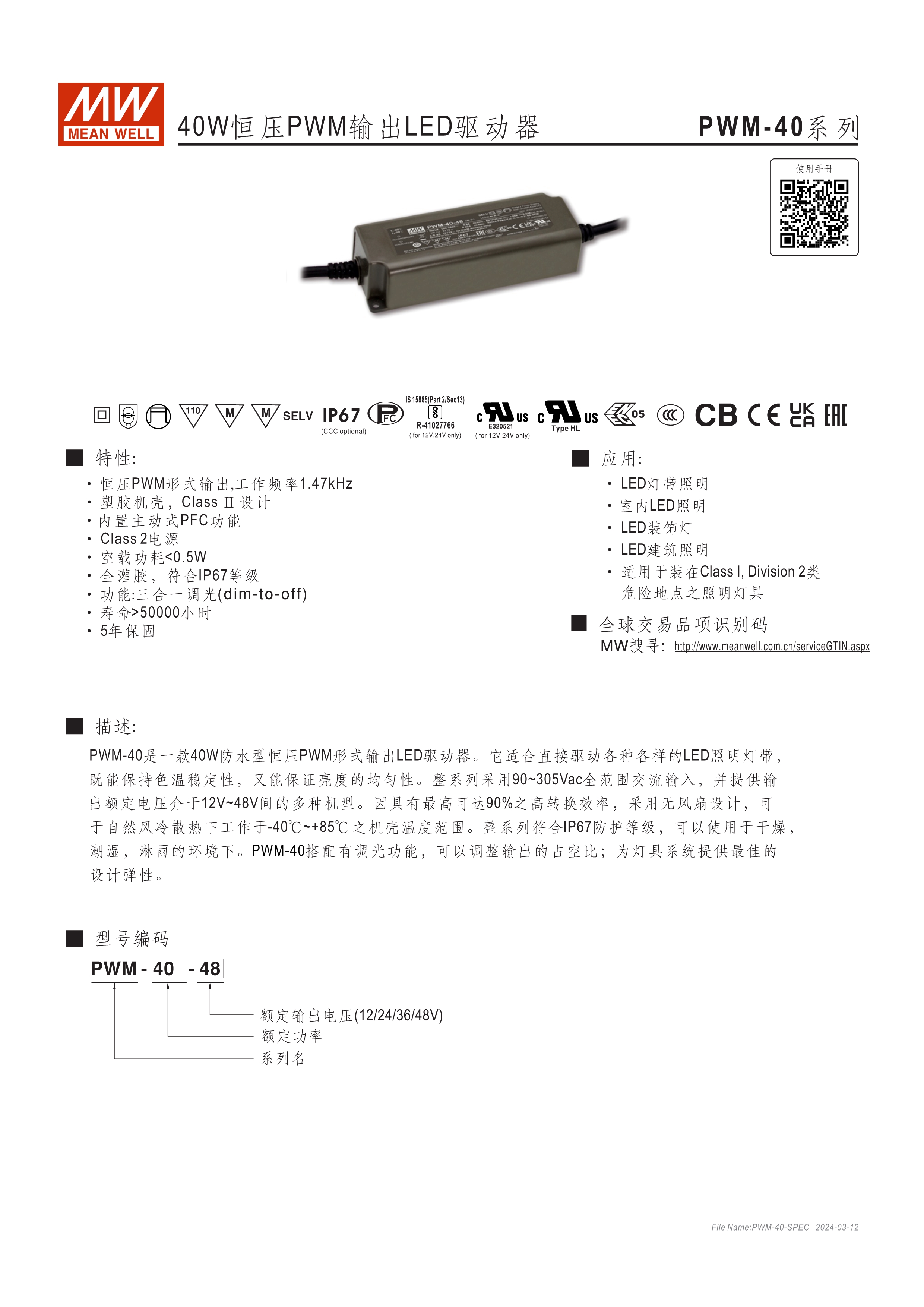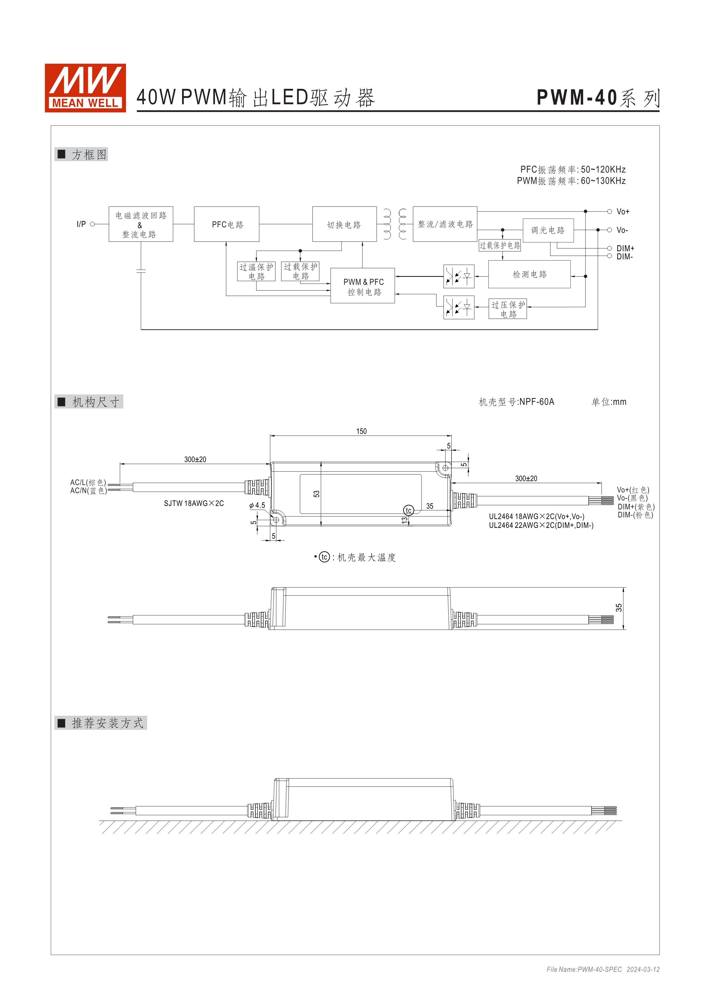 90~305VAC交流輸入, 內(nèi)建主動式功率因子矯正功能(active PFC) 塑料外殼,IP67防護等級 恒壓PWM輸出 Class II設(shè)計,無FG 空載待機消耗瓦數(shù)<0.5W 內(nèi)建三合一調(diào)光功能(0~10VDC, PWM信號或電阻,可關(guān)斷) 5年保固期