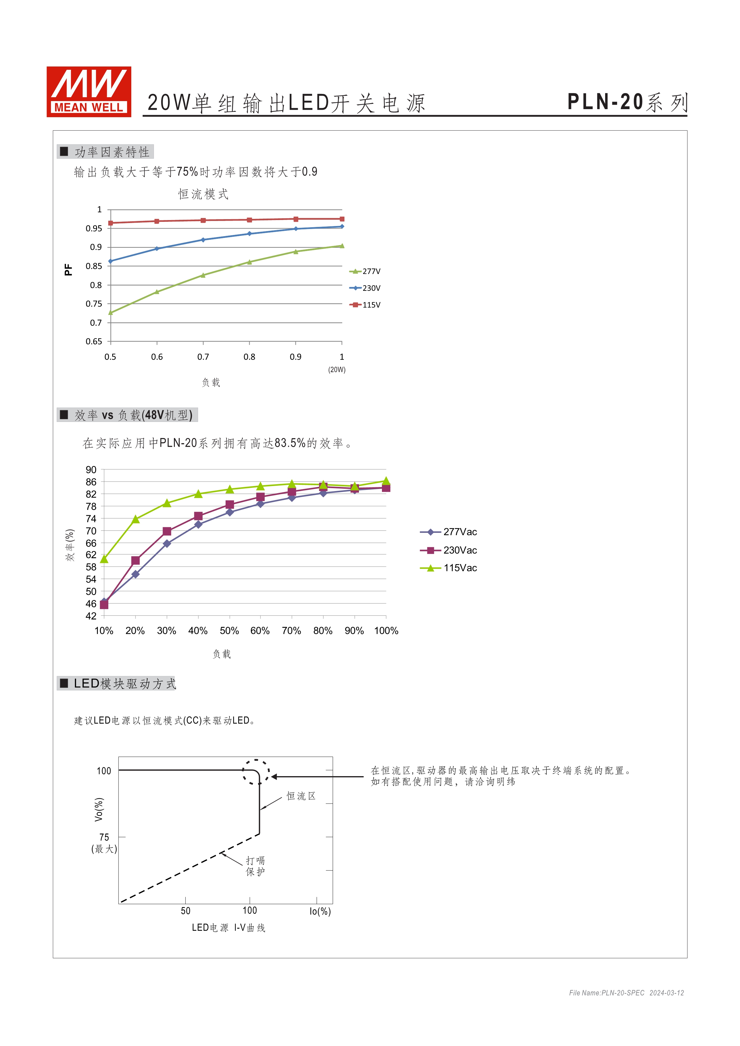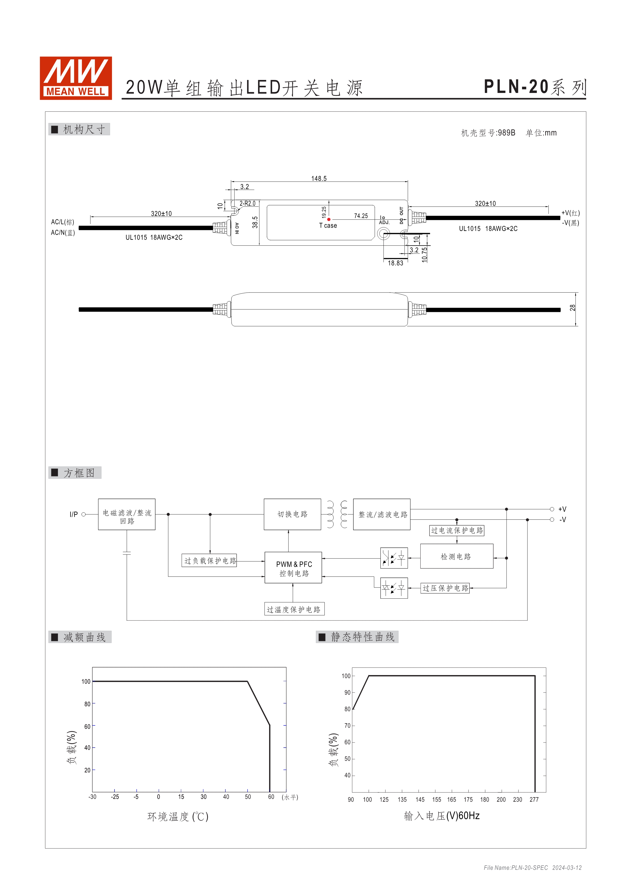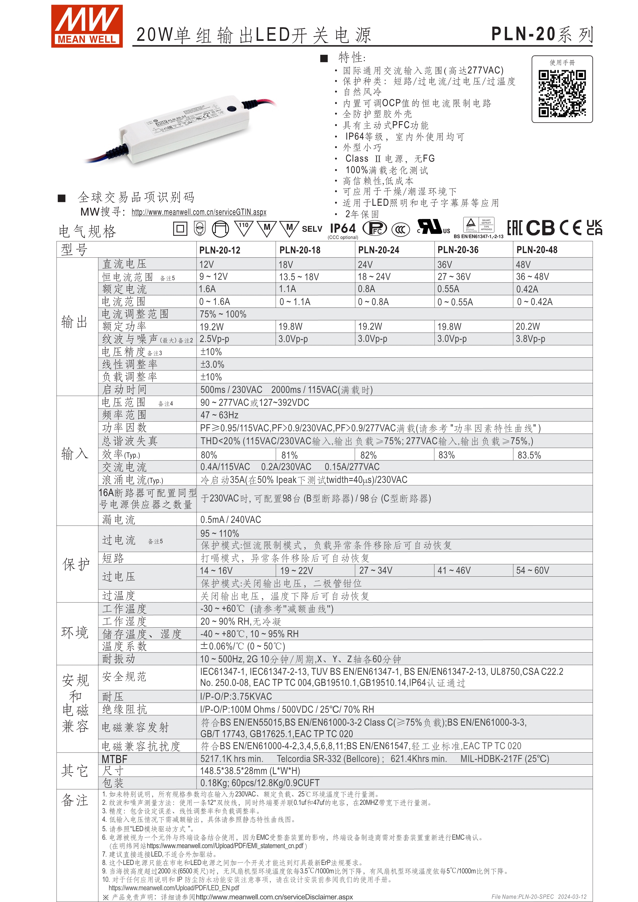 90~295VAC交流輸入(PLN-20為90~277VAC), 內建主動式功率因子矯正功能(active PFC) 塑料外殼,IP64防護等級 適合于LED室內照明及LED電子廣告牌相關應用