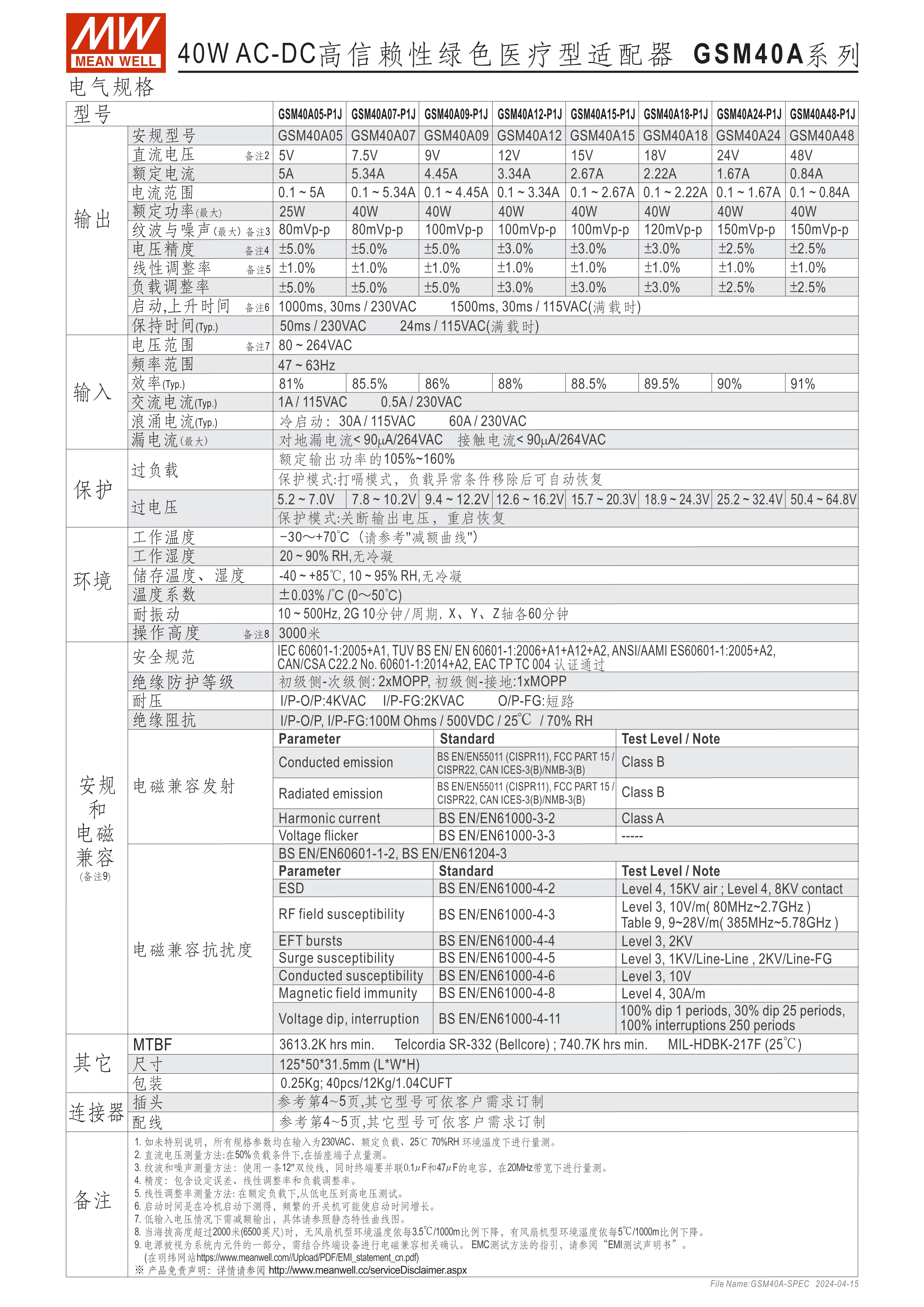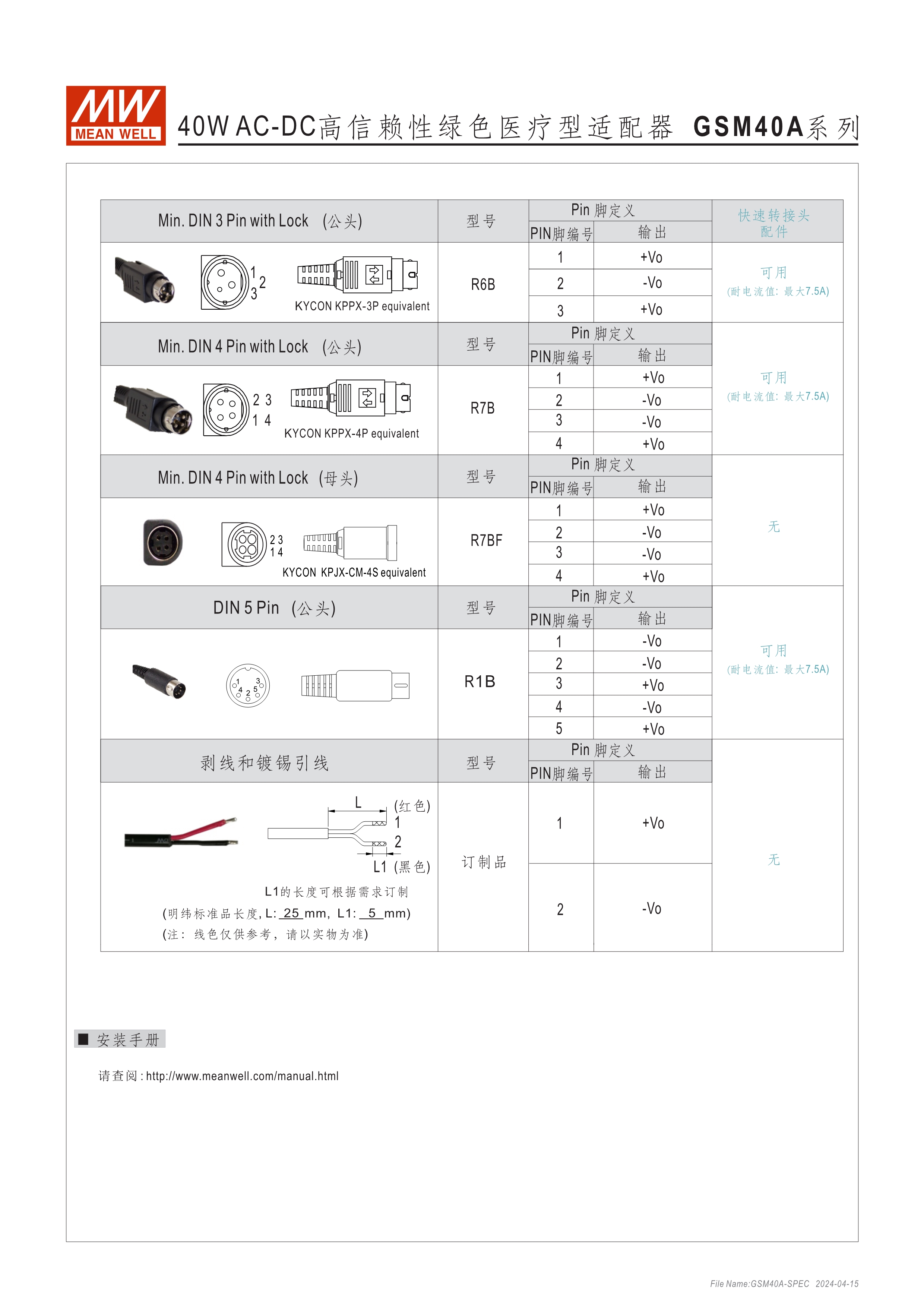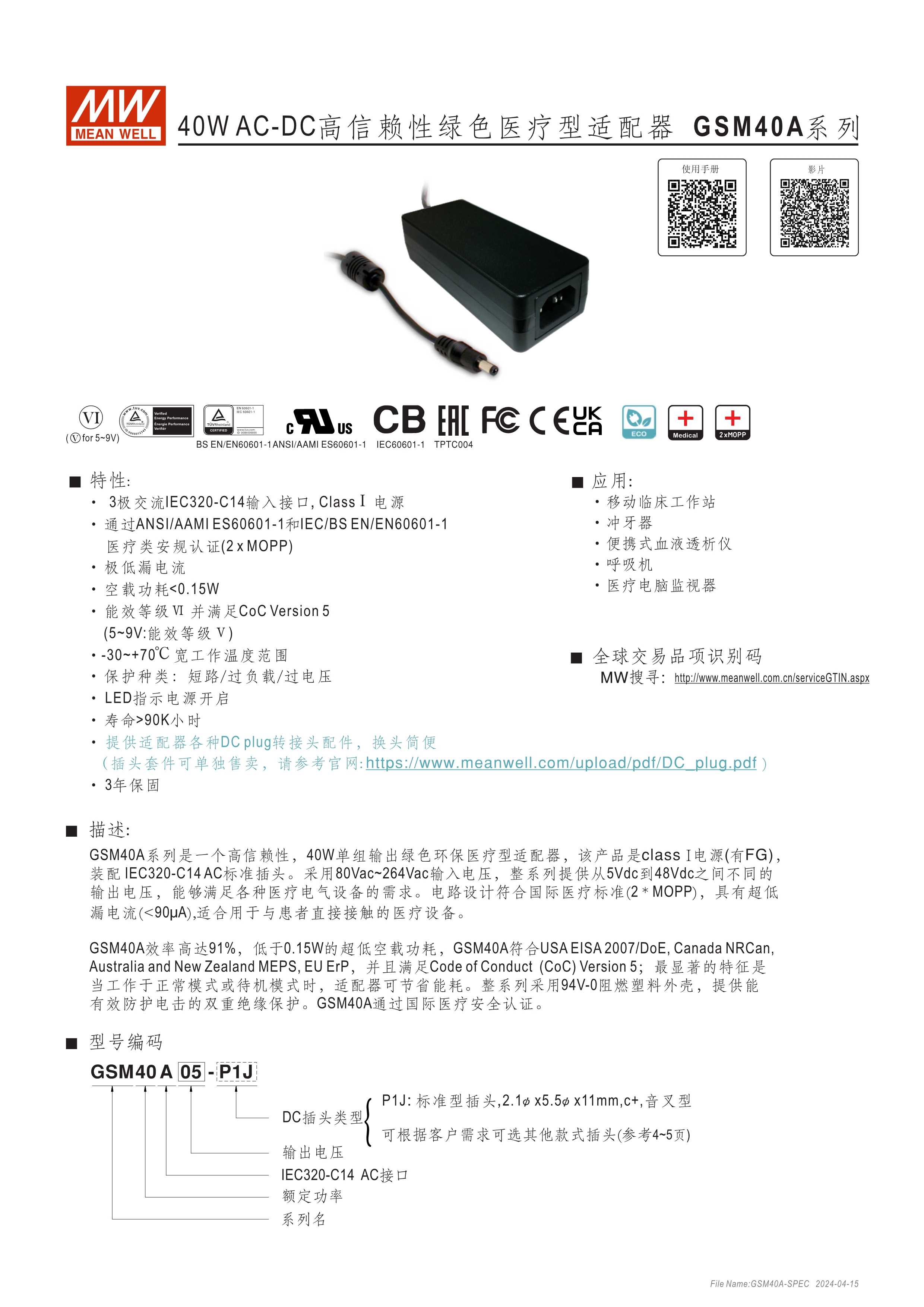 通過醫(yī)療60601-1認(rèn)證(2xMOPP),BF應(yīng)用(僅B型) 能效 VI 級(jí) 空載損耗<0.1W~0.15W 符合EISA/DoE、NRCan、ErP 及CoC Version 5 A型:Class I 電源(有接地PIN),IEC 320-C14接口 B型:Class II 電源(無接地PIN),IEC 320-C8接口 極端漏電流<50~175uA(依型號(hào)) -30~+70℃工作溫度 多種DC輸出轉(zhuǎn)接頭可更換 3年保固