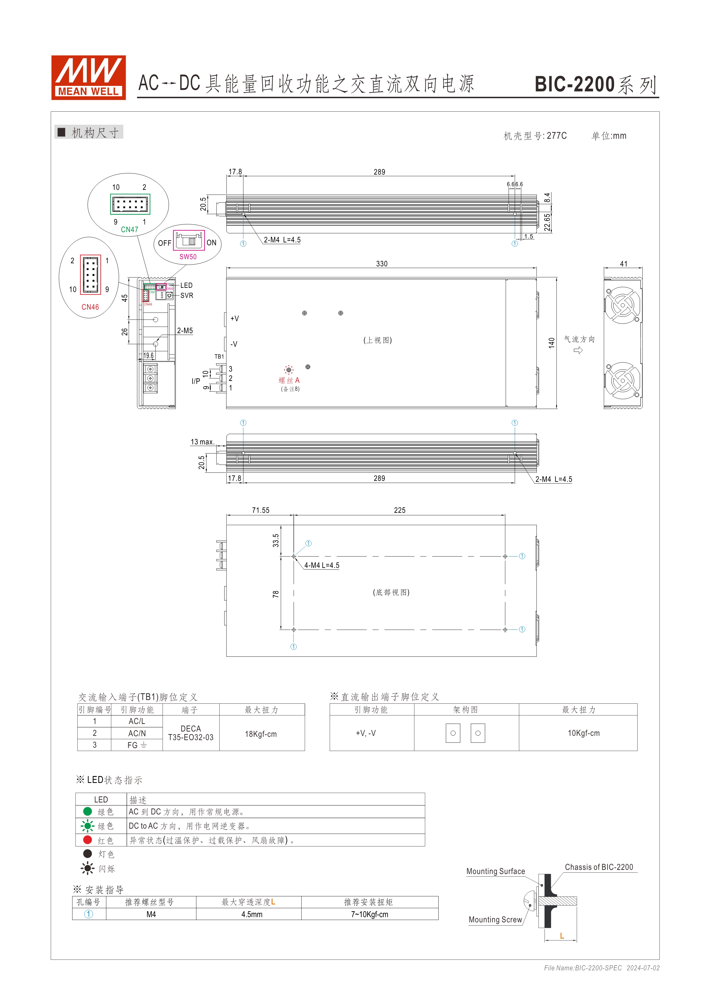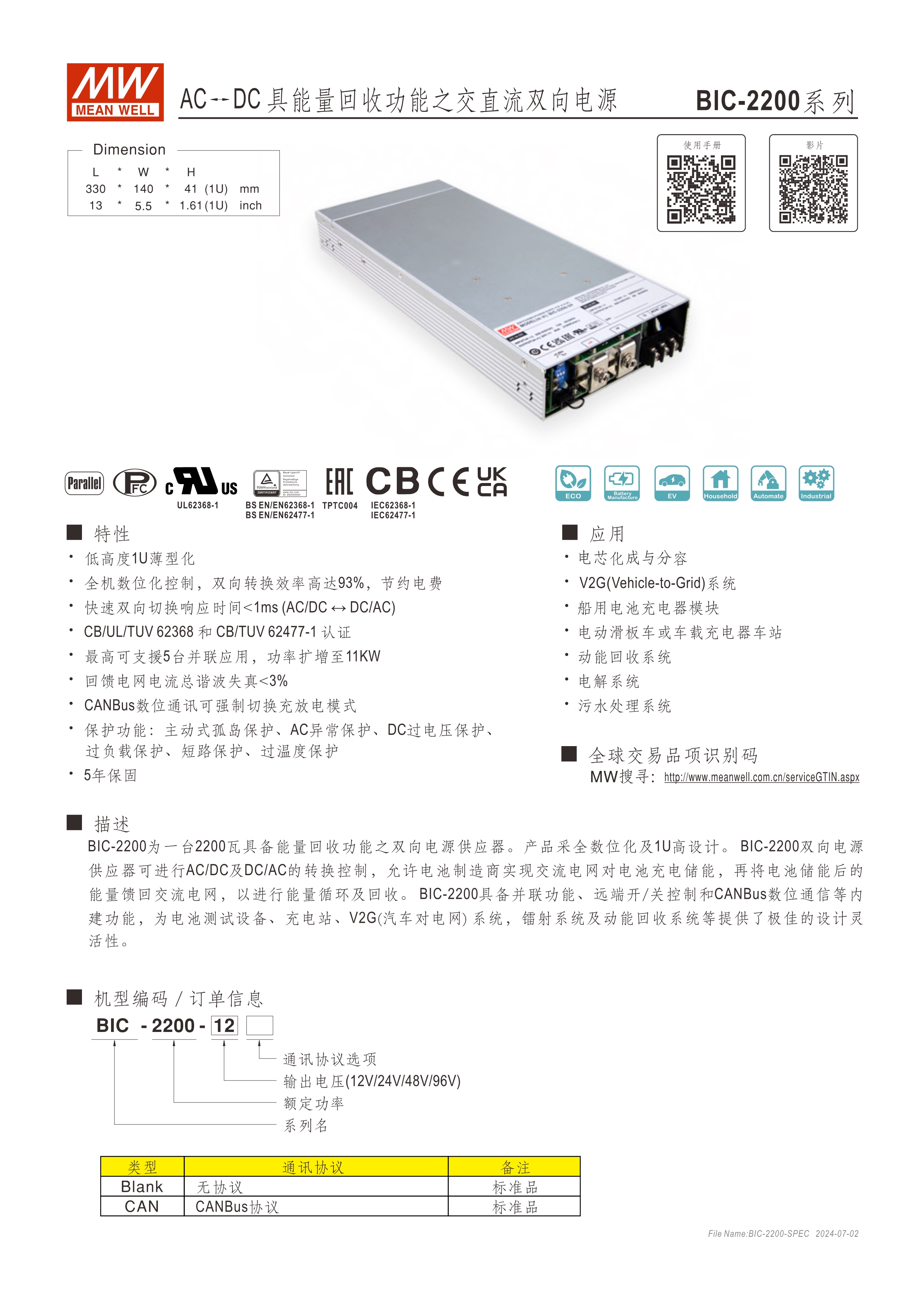 系統(tǒng)電源解決方案 (PDF) 低高度1U薄型化設計 全機數(shù)字化控制,雙向轉換效率高達93% 快速雙向切換響應時間<1ms (AC/DC ? DC/AC) CB/UL/TUV 62368法規(guī)認證,電路設計符合IEC 62477法規(guī) 最高可支持5臺并聯(lián)應用,功率擴增至11kW 回饋電網(wǎng)電流總諧波失真<3% 數(shù)字通訊可強制切換充放電模式(選配CANBus機型) 保護功能:主動式孤島保護、AC異常保護、DC過電壓保護、過負載保護、短路保護、過溫度保護 5年保固